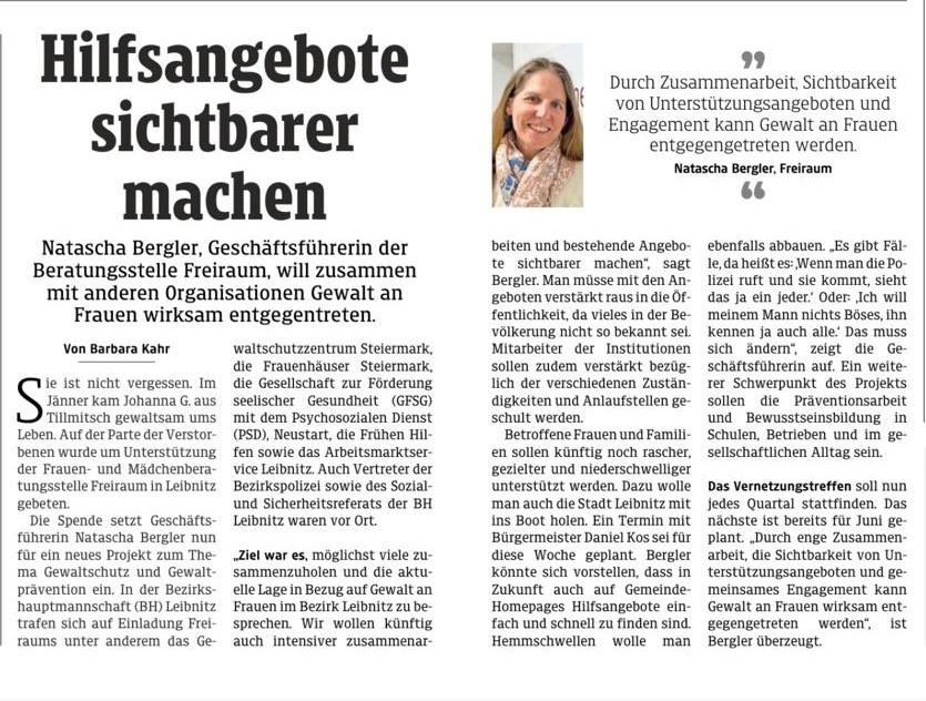 If you’ve found a malfunction or have ideas for improvement, we’ll be happy to hear from you. You can reach out to the website’s operators by using the following email beratung@freiraum-leibnitz.at